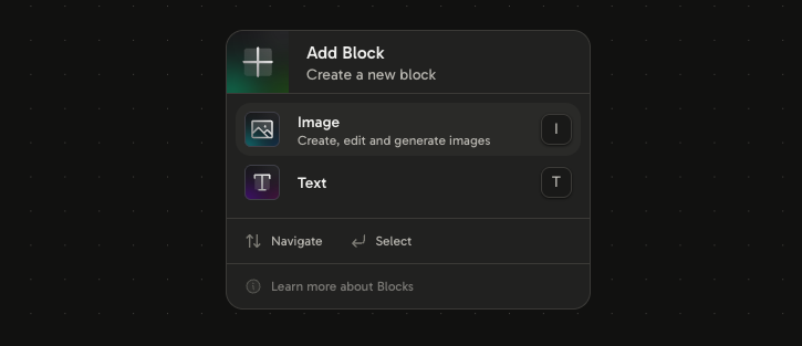 - Iterating on design ideas by connecting multiple Text or Prompt Blocks to the same Image Block.