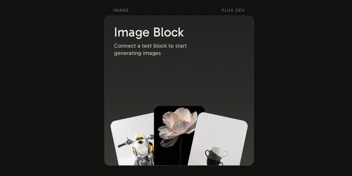 An Image Block is used to generate or display images in your canvas.It can receive inputs from other blocks (such as Text Blocks or Reference Blocks) and transform them into images powered by AI models.